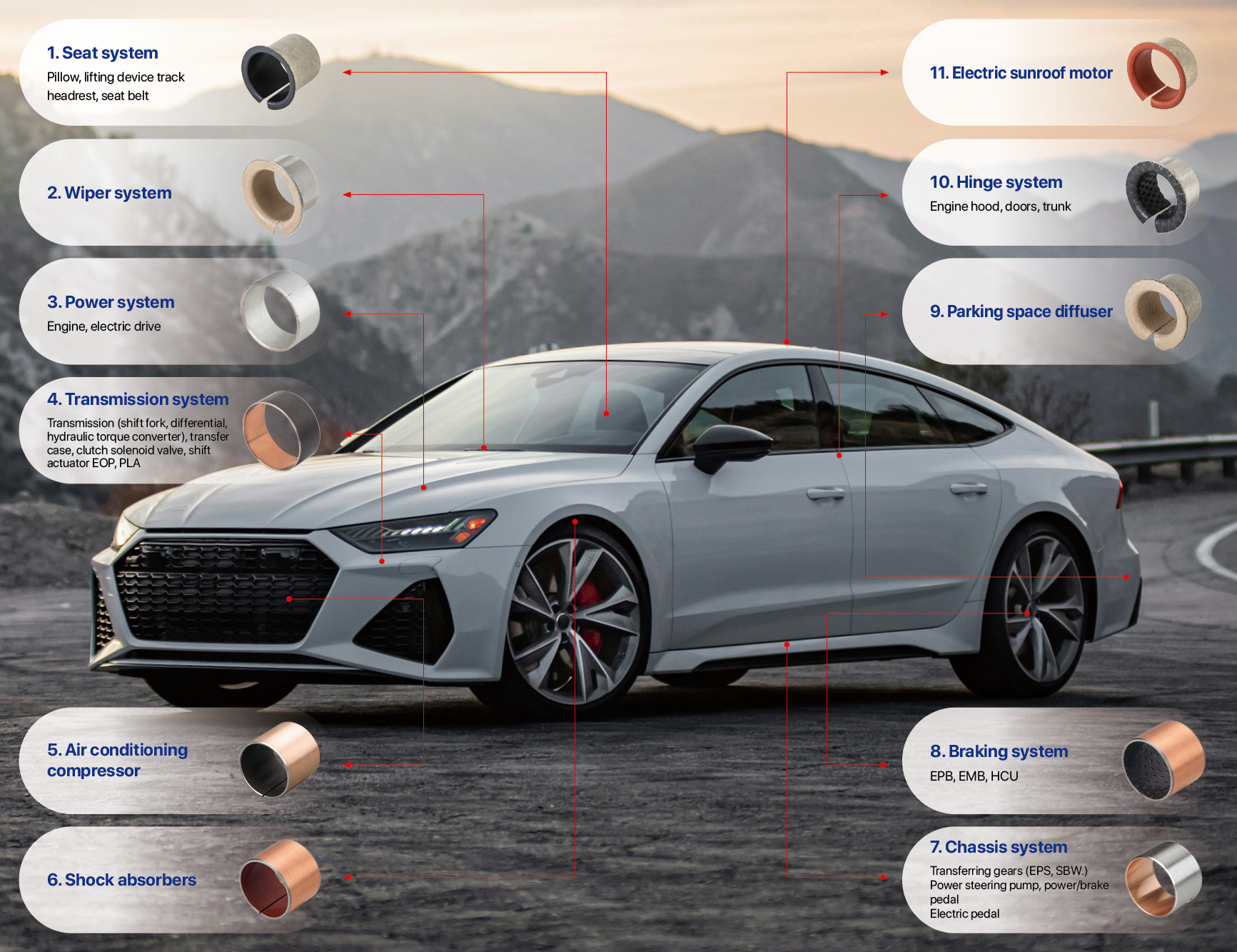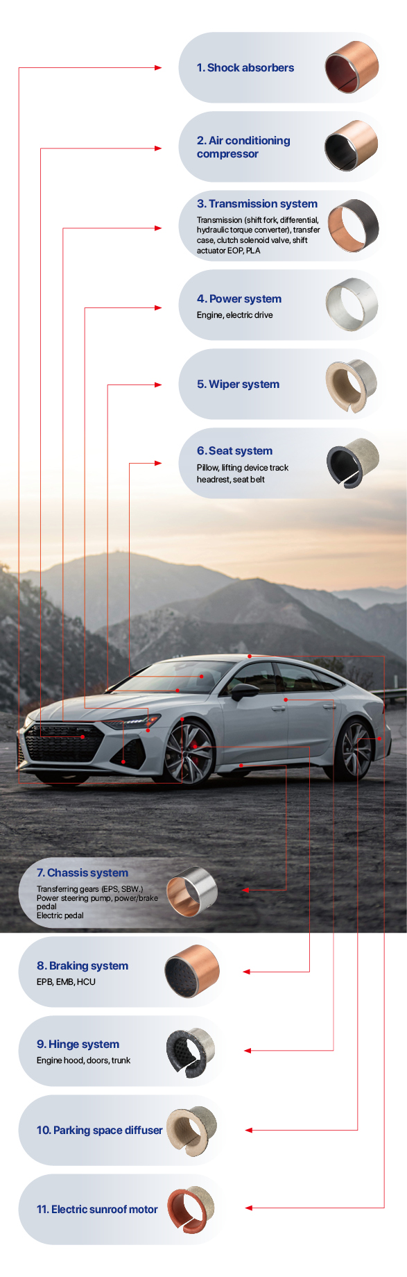 At least 30 or more parts of a passenger car are equipped with self-lubricating bearings. For example: tensioner, air conditioning compressor, secondary air valve, fuel pump, starter motor, gearbox, steering pump, steering column, shock absorber, brake system, pedal assembly, seat adjustment system, door hinge, trunk hinge, hood hinge, wiper, solenoid valve, electric drive, etc.