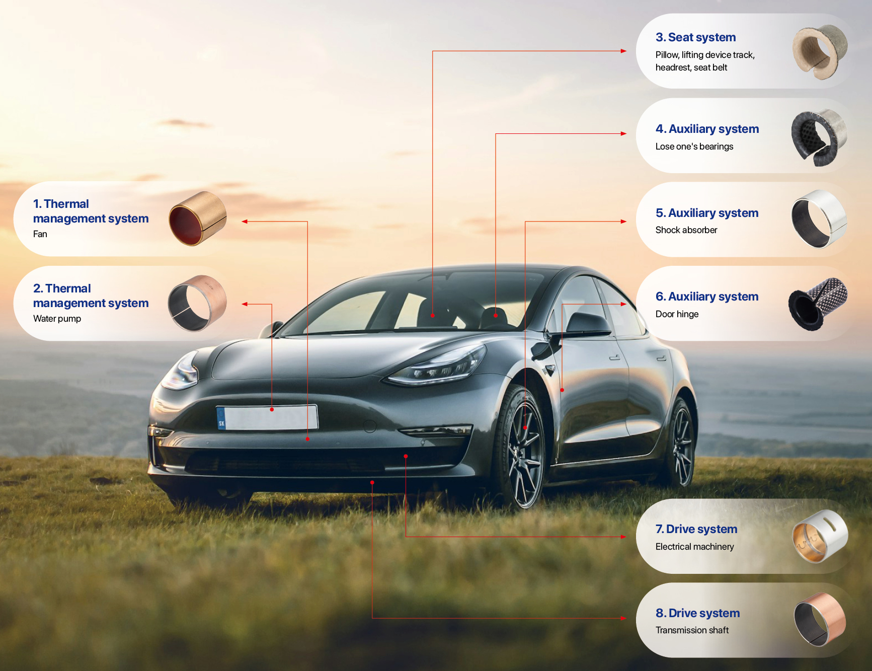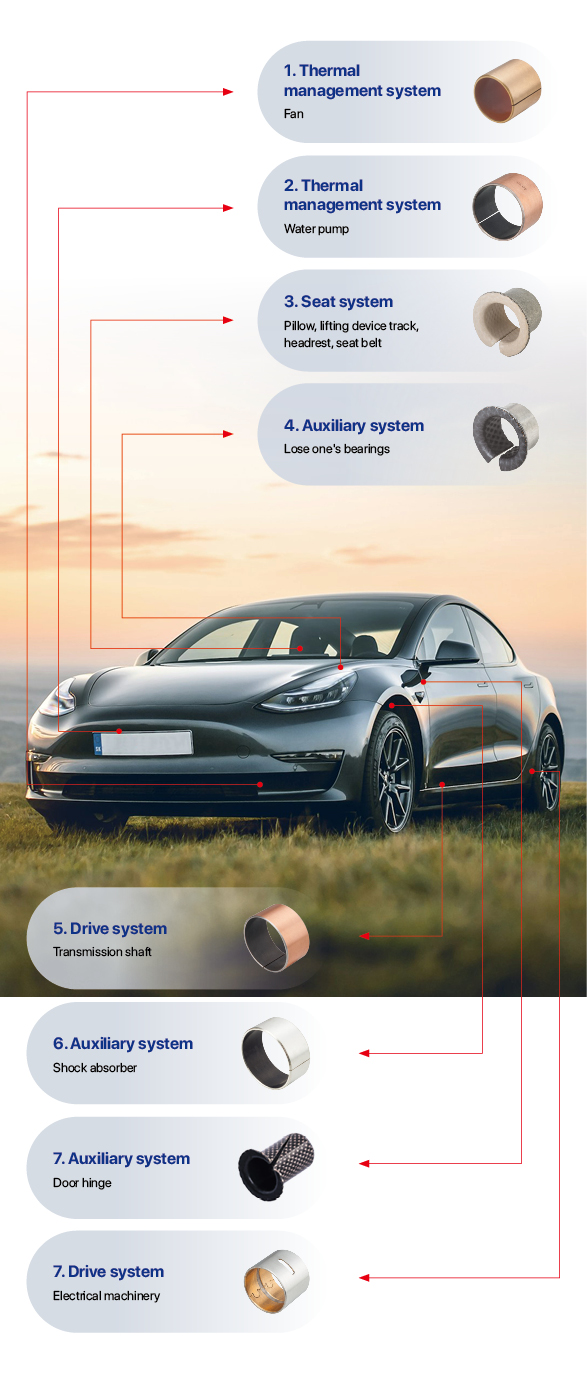 With the vigorous rise of the new energy vehicle industry, more stringent requirements have been put forward for the performance standards of components, especially in terms of lightweight design, low-noise operation, oil-free maintenance, and long life maintenance free.Self lubricating bearings rely on their unique advantages——The simple and efficient structural design, excellent load-bearing capacity, outstanding vibration absorption and impact resistance characteristics, as well as the convenience of lubrication free and maintenance free operation, comfort of low-noise operation, and outstanding performance of wear resistance, corrosion resistance, and lightweight, have won widespread application and praise in the field of new energy vehicles.
