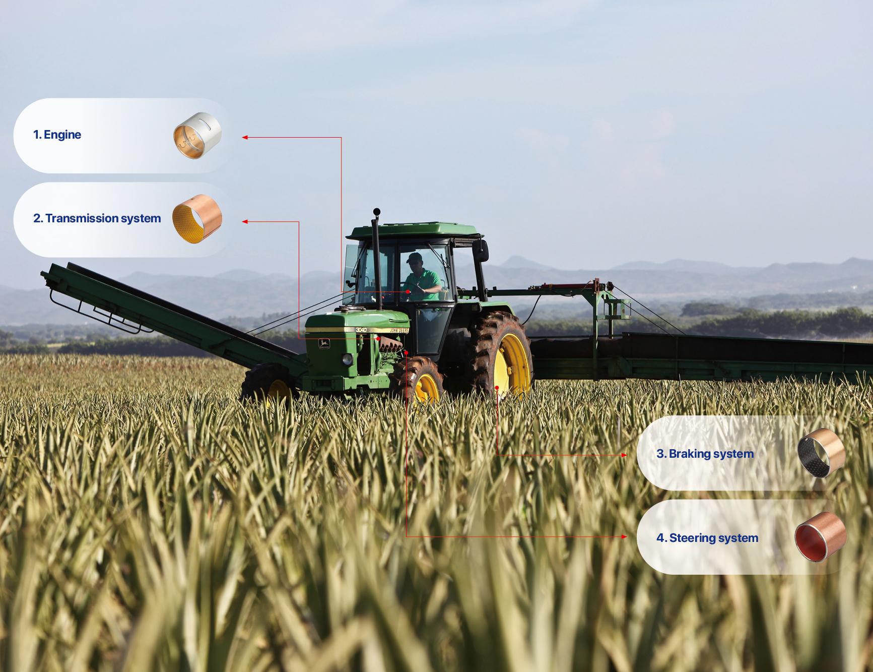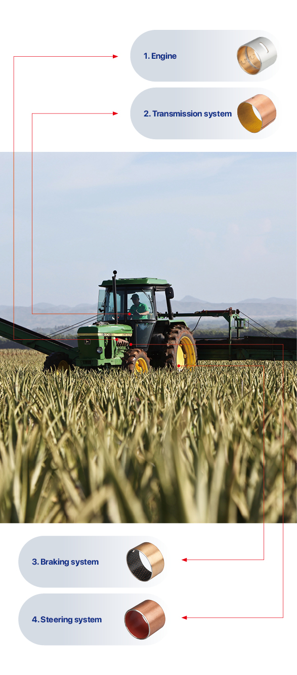 Due to its maintenance free nature and excellent wear resistance under dust and outdoor conditions, self-lubricating bearings are widely used in oil cylinders, suspension systems, joint parts, and other parts of combine harvesters, seeders, balers, crushers, tractors that cannot be oiled or have difficulty forming an oil film.