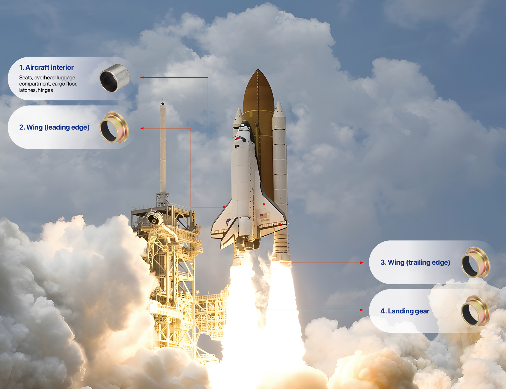 In order to meet the diverse application needs inside the aircraft, we have carefully designed various sliding bearing products. Whether it's the seats, hinges, latches, or overhead luggage compartment, our bearings can achieve efficient and stable operation, creating a more comfortable and convenient riding environment for passengers.